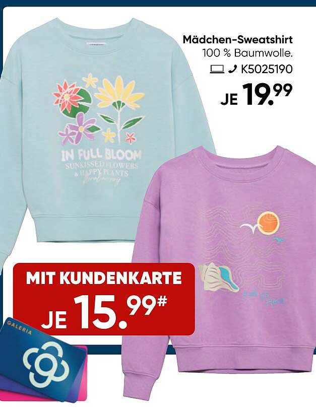 Ursprünglich für 19,99 € angeboten, ist das Mädchen-Sweatshirt jetzt für nur 15,99 € erhältlich, wenn du eine Kundenkarte verwendest. Diese Ersparnis von 4,00 € macht das Angebot besonders attraktiv und zeigt, wie viel du bei Galeria sparen kannst.