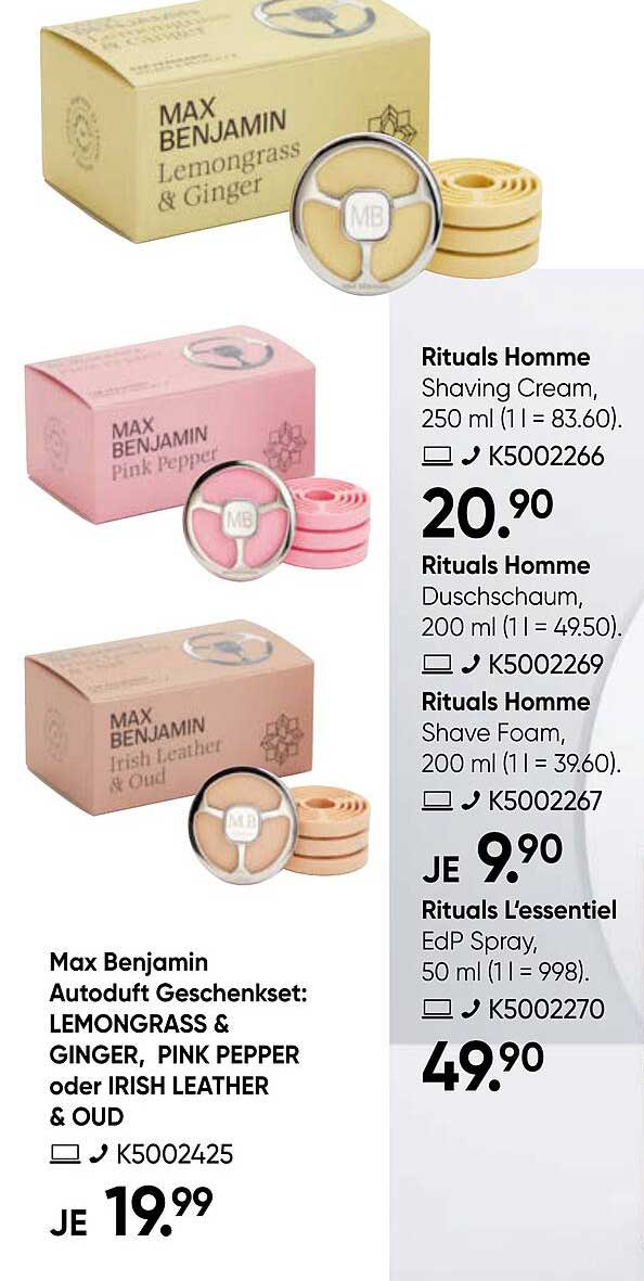 Sehen Sie sich jetzt das Max Benjamin Autoduft Geschenkset: LEMONGRASS & GINGER, PINK PEPPER oder IRISH LEATHER & OUD Angebot im Galeria Prospekt an. Dieses Angebot ist gültig von 09.10.2024 bis 15.10.2024.