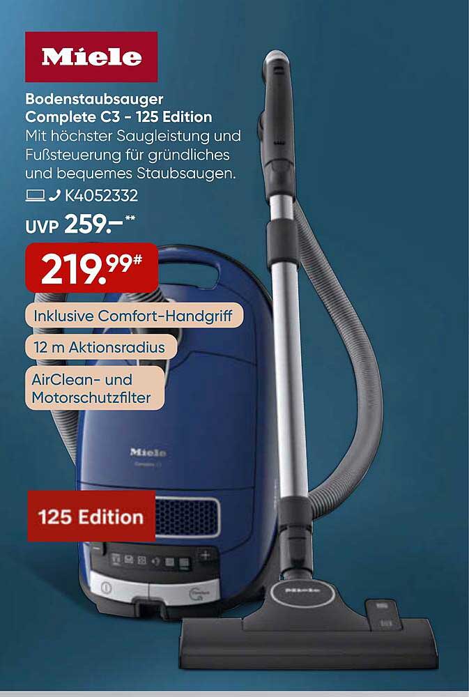 Möchten Sie sofort informiert werden, sobald das Miele Bodenstaubsauger Complete C3 - 125 Edition im Angebot ist? Melden Sie sich für unsere Angebots-Benachrichtigungen an. So erhalten Sie eine Benachrichtigung, sobald das Produkt zu einem günstigen Preis verfügbar ist.