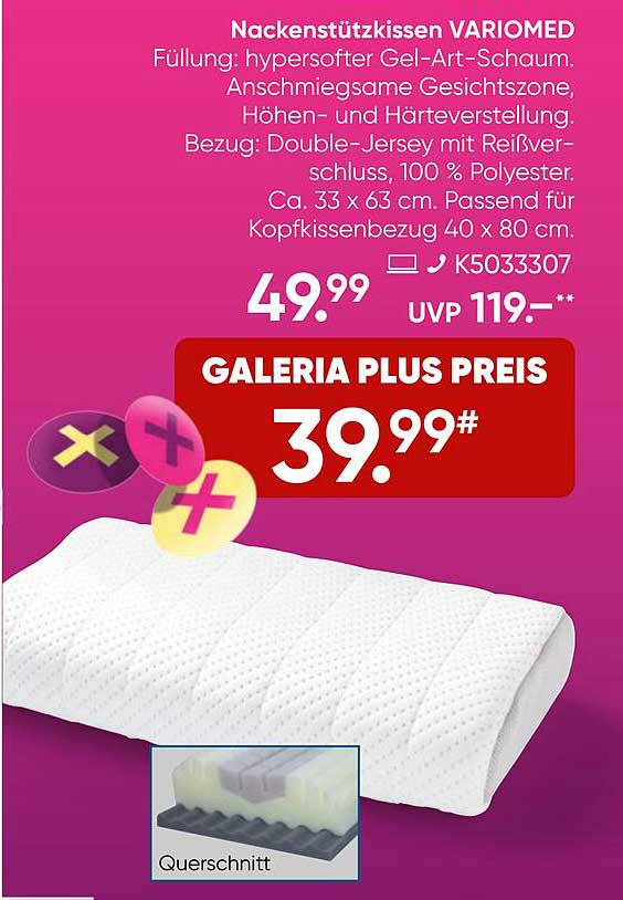 Der reguläre Preis für das Nackenstützkissen VARIOMED liegt bei 49,99 €. Aktuell profitieren Sie jedoch von einem exklusiven Galeria Plus Preis von nur 39,99 €, was eine Ersparnis von 10,00 € bedeutet. Dies ist eine hervorragende Gelegenheit, um in Ihre Schlafqualität zu investieren und Ihre Nackenprobleme nachhaltig zu lindern.
