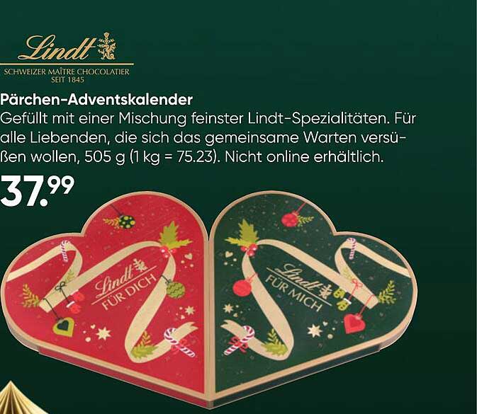 Entdecken Sie das großartige Pärchen-Adventskalender Angebot im neuesten Galeria Prospekt. Neben diesem Angebot finden Sie noch viele weitere attraktive Rabatte. Sie können das Pärchen-Adventskalender einfach online über die Galeria Website bestellen oder in einem Geschäft in Ihrer Nähe kaufen.