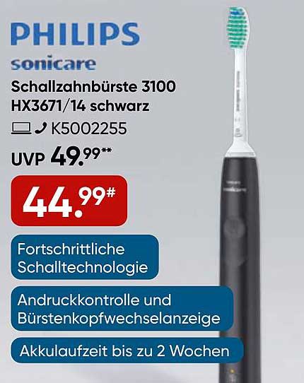 Sehen Sie sich das Philips Sonicare Schallzahnbürste 3100 Hx3671/14 Schwarz Angebot bei Galeria an! Dieses fantastische Angebot ist jetzt im neuesten Galeria Prospekt verfügbar. Nutzen Sie diese Chance und sparen Sie viel bei Ihrem Einkauf.