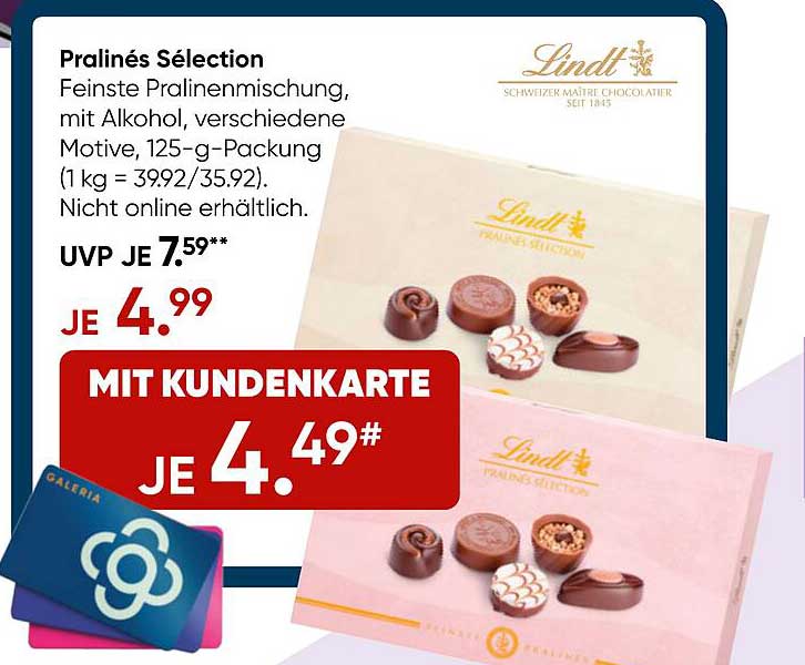 Sehen Sie sich jetzt das Pralinés Sélection von Lindt – Feine Pralinien Mischung Angebot im Galeria Prospekt an. Dieses Angebot ist gültig von 02.04.2025 bis 08.04.2025.