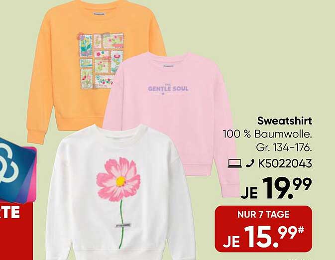 Entdecken Sie das großartige Sweatshirt Angebot im neuesten Galeria Prospekt. Neben diesem Angebot finden Sie noch viele weitere attraktive Rabatte. Sie können das Sweatshirt einfach online über die Galeria Website bestellen oder in einem Geschäft in Ihrer Nähe kaufen.