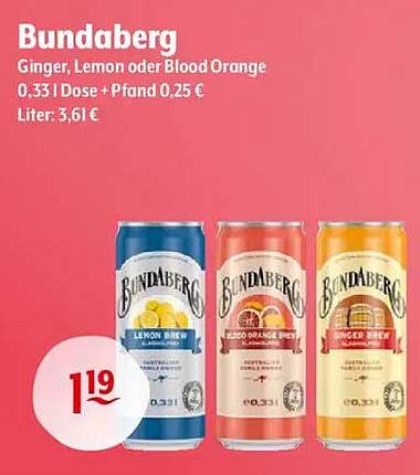 Sehen Sie sich jetzt das Bundaberg Ginger, Lemon oder Blood Orange 0,33 l Dose Angebot im Getränke Hoffmann Prospekt an. Dieses Angebot ist gültig von 30.06.2025 bis 05.07.2025.