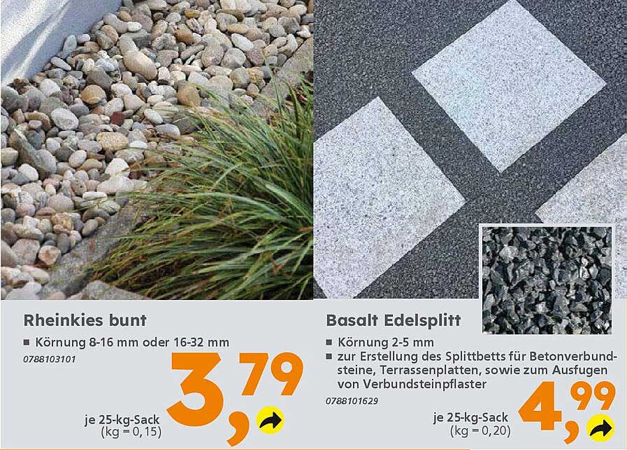 Der Rheinkies bunt ist aktuell für nur 3,79 Euro erhältlich, während der Basalt Edelsplitt für 4,99 Euro angeboten wird. Im Vergleich zu herkömmlichen Preisen sparen Sie durch dieses Angebot erheblich. Nutzen Sie die Gelegenheit, sich hochwertige Materialien zu einem tollen Preis zu sichern!