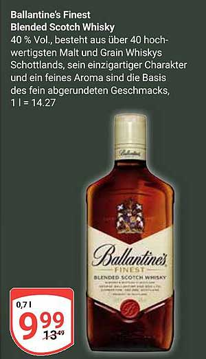 Sehen Sie sich jetzt das Ballantine's Finest Blended Scotch Whisky Angebot im Globus Prospekt an. Dieses Angebot ist gültig von 24.03.2025 bis 29.03.2025.