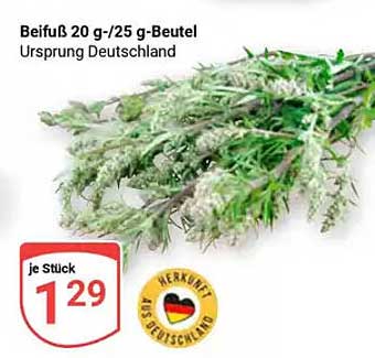 Möchten Sie sofort informiert werden, sobald das Beifuß 20 G-/25 G-Beutel im Angebot ist? Melden Sie sich für unsere Angebots-Benachrichtigungen an. So erhalten Sie eine Benachrichtigung, sobald das Produkt zu einem günstigen Preis verfügbar ist.