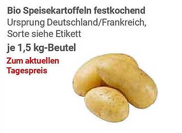 Sehen Sie sich jetzt das Bio Speisekartoffeln festkochend je 1,5 kg-Beutel Angebot im Globus Prospekt an. Dieses Angebot ist gültig von 01.09.2025 bis 06.09.2025.