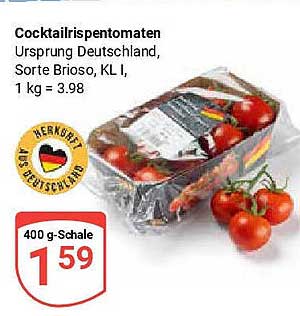 Sehen Sie sich jetzt das Cocktailrispentomaten – 400 g zum Einführungspreis von nur 1,59 € Angebot im Globus Prospekt an. Dieses Angebot ist gültig von 22.09.2025 bis 27.09.2025.