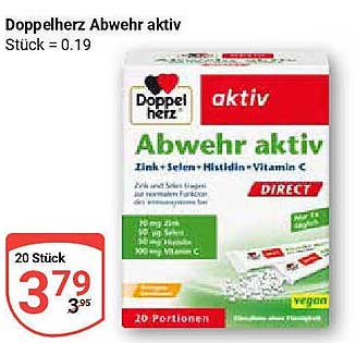 Das Angebotspreis für Doppelherz Abwehr aktiv liegt bei nur 3,79 Euro, im Vergleich zum vorherigen Preis von 3,95 Euro. Dies bedeutet eine Ersparnis von 0,16 Euro. Ein hervorragendes Preis-Leistungs-Verhältnis für ein Produkt, das so viele Vorteile für die Gesundheit bieten kann.