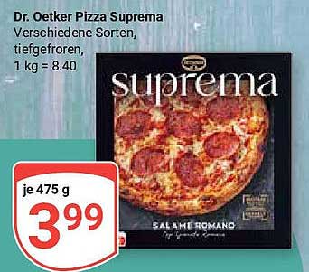 Aktuell kannst du die Dr. Oetker Pizza Suprema für nur 3,99 € erwerben. Im Vergleich zum Normalpreis von 8,40 € pro Kilogramm ist dies eine bemerkenswerte Ersparnis von über 50%! Damit ist es der ideale Zeitpunkt, um mehrere Pizzen auf einmal zu kaufen und für zukünftige Anlässe zu lagern.