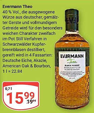 Entdecken Sie den Evermann Theo, ein hochwertiger Spirituosen-Genuss, der mit 40 % Vol. aus feinsten, gemälzten Gersten in Deutschland hergestellt wird. Dieser besondere Whisky überzeugt durch seine ausgewogene Würze und den vollmundigen Charakter, der Liebhaber edler Getränke begeistern wird. Ideal für gesellige Abende oder als perfektes Geschenk für Whisky-Liebhaber, ist dieses Angebot eine hervorragende Wahl.