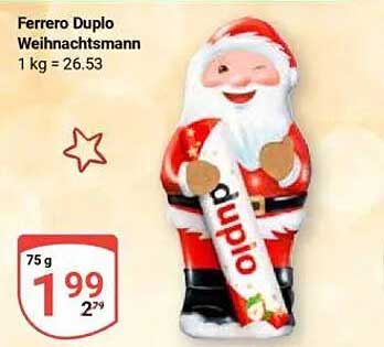Sehen Sie sich das Ferrero Duplo Weihnachtsmann Angebot bei Globus an! Dieses fantastische Angebot ist jetzt im neuesten Globus Prospekt verfügbar. Nutzen Sie diese Chance und sparen Sie viel bei Ihrem Einkauf.