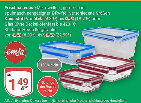 Sehen Sie sich jetzt das Frischhaltedosen von Emsa – Mikrowellen-, gefrier- und spülmaschinengeeignet Angebot im Globus Prospekt an. Dieses Angebot ist gültig von 20.10.2025 bis 25.10.2025.