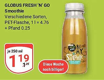 Die GLOBUS FRESH 'N' GO Smoothies werden aus hochwertigen Zutaten hergestellt und sind in verschiedenen Geschmacksrichtungen erhältlich. Jede Flasche enthält 250 ml des köstlichen Getränks, das in einer praktischen PET-Flasche angeboten wird. Den Smoothies liegt ein Pfand von 0,25 Euro bei.