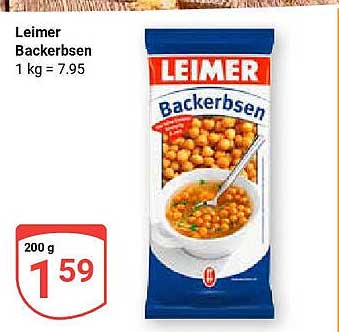 Sehen Sie sich jetzt das Leimer Backerbsen 200 g Angebot im Globus Prospekt an. Dieses Angebot ist gültig von 15.09.2025 bis 20.09.2025.
