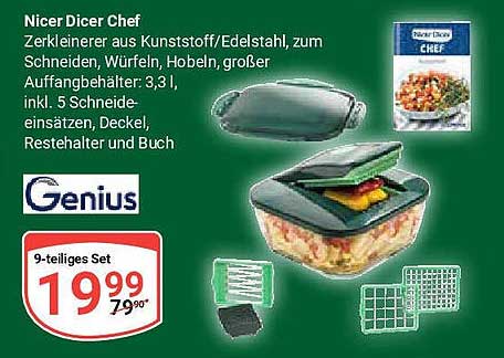 Der Nicer Dicer Chef ist aktuell zum Preis von 7,99 € erhältlich, im Vergleich zum regulären Preis von 19,99 €. Das bedeutet eine Ersparnis von 12 €, was dieses Angebot zu einer großartigen Gelegenheit macht, ein qualitativ hochwertiges Küchengerät zu einem unschlagbaren Preis zu erwerben. Nutzen Sie diese Chance, um Ihre Küche effizienter zu gestalten!