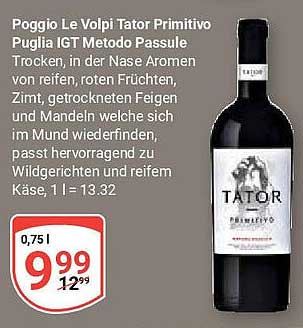 Sehen Sie sich jetzt das Poggio Le Volpi Tator Primitivo Puglia IGT Metodo Passule 0,75 l Angebot im Globus Prospekt an. Dieses Angebot ist gültig von 13.10.2025 bis 18.10.2025.