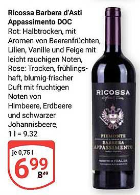 Sehen Sie sich jetzt das Ricossa Barbera d'Asti Appassimento DOC - Halbtrockener Rotwein Angebot im Globus Prospekt an. Dieses Angebot ist gültig von 13.10.2025 bis 18.10.2025.