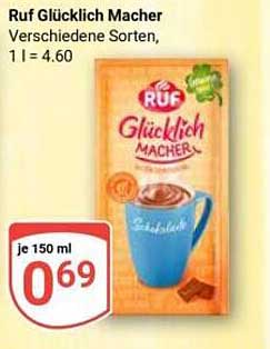 Der "Ruf Glücklich Macher" wird aus hochwertigen Zutaten hergestellt und hat sich durch seinen hervorragenden Geschmack einen Namen gemacht. Jede Packung enthält 150 ml, und mit einem Preis von nur 0,69 Euro ist es eine tolle Möglichkeit, sich einen kleinen Luxus zu gönnen. Beachten Sie auch, dass der Literpreis bei 4,60 Euro liegt, was dieses Produkt zu einer preiswerten Wahl für alle macht, die Genuss schätzen.
