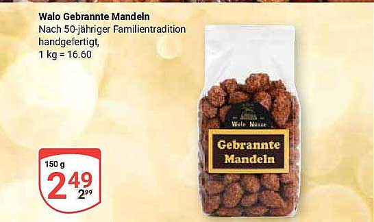 Der aktuelle Preis für die Walo Gebrannten Mandeln liegt bei nur 2,49 Euro, im Vergleich zum regulären Preis von 2,99 Euro. Das bedeutet für Sie eine Ersparnis von 0,50 Euro! Greifen Sie zu und genießen Sie diese köstliche Delikatesse zu einem attraktiven Preis.