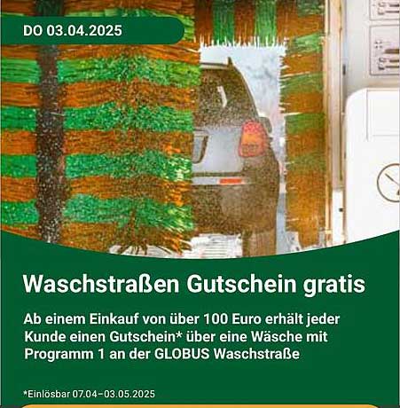 Sehen Sie sich jetzt das Waschstraßen Gutschein gratis Angebot im Globus Prospekt an. Dieses Angebot ist gültig von 31.03.2025 bis 05.04.2025.