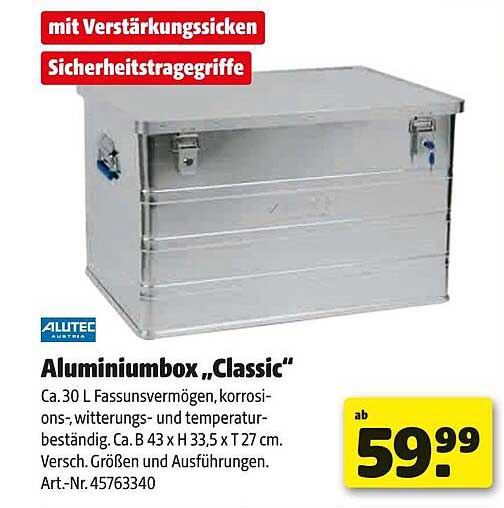 Mit einem Preis von nur 59,99 € bietet die Aluminiumbox "Classic" ein hervorragendes Preis-Leistungs-Verhältnis. Im Vergleich zu anderen Aufbewahrungslösungen in dieser Qualität und Funktionalität ist dies ein echtes Schnäppchen. Nutzen Sie die Gelegenheit, und sichern Sie sich diese Box zum besten Preis!