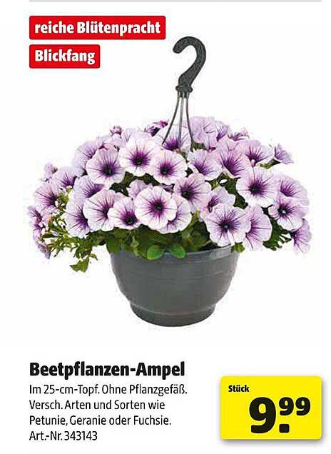 Entdecken Sie die wunderschöne Beetpflanzen-Ampel, die Ihnen blühende Freude in Ihren Garten oder auf Ihrem Balkon bringt. Ab dem 12. April bis zum 19. April 2025 erhalten Sie die Möglichkeit, die farbenfrohen Pflanzen zu einem unschlagbaren Preis zu erwerben. Diese Ampel ist nicht nur ein echter Blickfang, sondern bringt auch reichlich Blütenpracht mit sich.