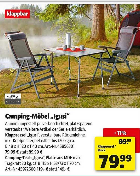 Der Klappstuhl „Igusi“ wird derzeit zum Preis von 79,99 € angeboten, was einer bemerkenswerten Ersparnis von 11 % gegenüber dem ursprünglichen Preis von 89,99 € entspricht. Auch der Camping-Tisch ist im Angebot für 119,00 € statt 149,00 €! Ein echtes Schnäppchen, das Sie sich nicht entgehen lassen sollten.