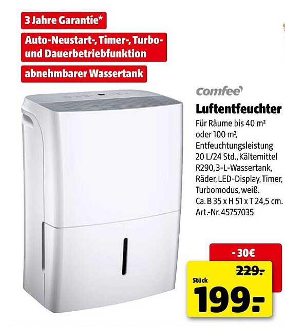 Dieses hervorragende Gerät wird aktuell zum Preis von 199 € angeboten, statt des regulären Preises von 229 €. Das bedeutet eine Ersparnis von 30 €, was dieses Angebot besonders attraktiv macht. Nutzen Sie die Möglichkeit, einen hochwertigen Luftentfeuchter zu einem reduzierten Preis zu erwerben!