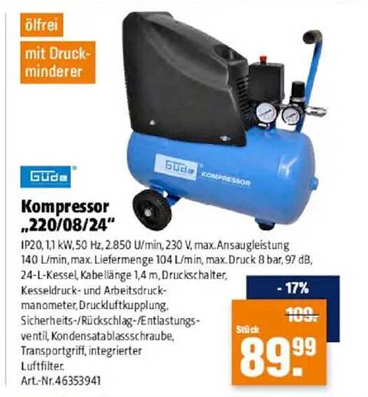 Entdecken Sie den leistungsstarken Kompressor "220/08/24" von Güde, der ideal für Heimwerker und Profis ist. Dieses kraftvolle Gerät ist nicht nur funktional, sondern auch zu einem unwiderstehlichen Preis erhältlich. Mit einer maximalen Ansaugleistung von 140 l/min und einem Arbeitsdruck von bis zu 8 bar bietet dieser Kompressor alles, was Sie für Ihre Projekte benötigen. Es ist ein echtes Highlight im Hagebau-Prospekt und eignet sich hervorragend für den Einsatz in der Werkstatt oder beim Bau.