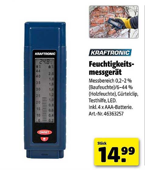 Das Krafttronic Feuchtigkeitsmessgerät ist das perfekte Werkzeug für alle Heimwerker und Profis, die präzise Feuchtigkeitswerte in verschiedenen Materialien messen möchten. Es handelt sich um ein äußerst nützliches Gerät, das nicht nur die Bausubstanz schützt, sondern auch hilft, optimale Bedingungen für Holz und andere Baustoffe zu gewährleisten. Ob beim Renovieren, beim Holzbau oder in der Holzverarbeitung - dieses Angebot ist zeitlich begrenzt und bietet eine fantastische Gelegenheit, ein hochwertiges Messgerät zu einem attraktiven Preis zu erwerben.