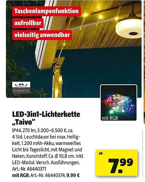 Die LED-3in1-Lichterkette „Taivo“ von CASAYA ist das perfekte Licht-Accessoire für alle, die einen Hauch von Magie in ihr Zuhause bringen möchten. Mit ihrer einzigartigen Funktionalität und ansprechenden Designs bringt sie nicht nur Licht, sondern auch eine besondere Atmosphäre in jeden Raum. Ideal für stimmungsvolle Abende im Garten oder festliche Anlässe im Wohnzimmer, ist dieses Angebot von Hagebau ein echtes Highlight.