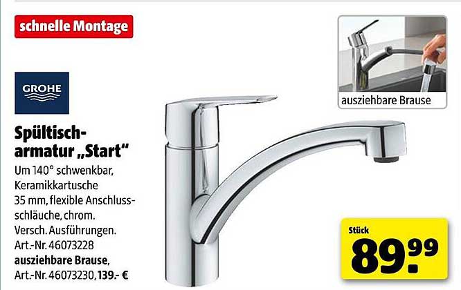 Auf der Suche nach einer modernen und funktionalen Spültischarmatur? Dann könnte die Grohe Spültischarmatur "Start" genau das sein, wonach Sie suchen! Diese hochwertige Armatur überzeugt nicht nur durch ihr elegantes Design, sondern auch durch ihre praktische Handhabung. Mit einer um 140° schwenkbaren Ausführung eignet sie sich perfekt für jede Küche und erleichtert Ihnen die tägliche Arbeit beim Spülen und Vorbereiten Ihrer Speisen.