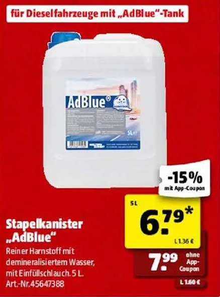 Aktuell ist der Stapelkannister "AdBlue" für nur 6,79 € erhältlich, was einen Preisnachlass von 15% bedeutet, wenn Sie einen App-Coupon nutzen. Der reguläre Preis liegt bei 7,99 €, was eine Ersparnis von 1,20 € pro Einheit darstellt. Solch ein Rabatt macht dieses Angebot besonders attraktiv für Autofahrer, die Wert auf Qualität und Umweltschutz legen.