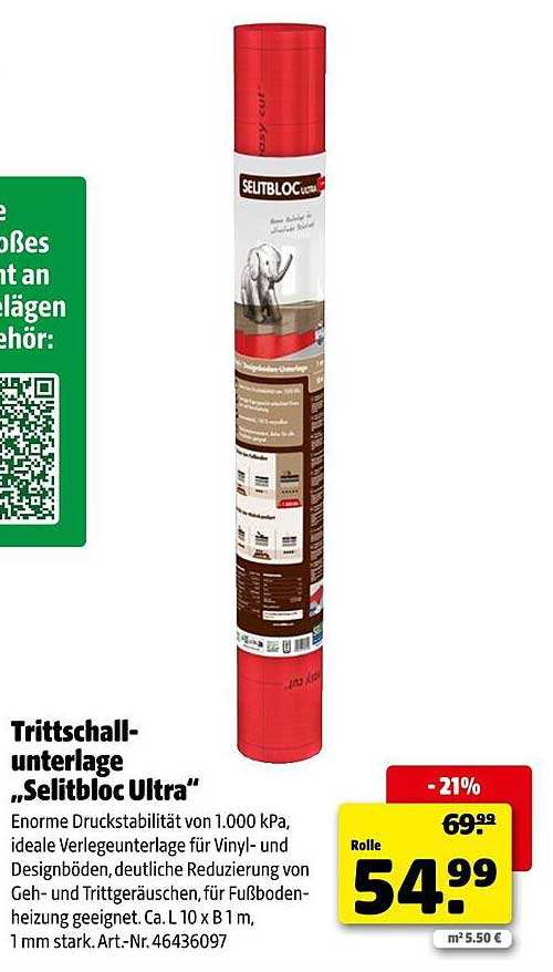 Sehen Sie sich jetzt das Trittschallunterlage „Selitbloc Ultra“ Angebot im Hagebau Prospekt an. Dieses Angebot ist gültig von 25.10.2025 bis 01.11.2025.