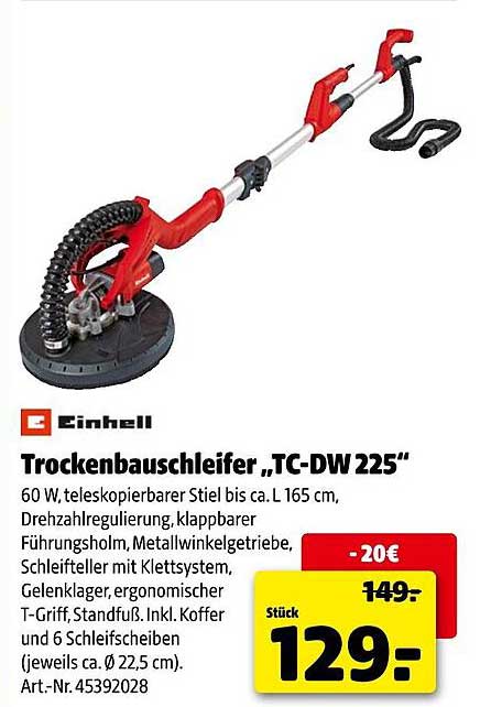 Ursprünglich für 149 € angeboten, erhalten Sie den Trockenbauschleifer nun zum Sonderpreis von nur 129 €. Das bedeutet eine Ersparnis von 20 €, die Ihnen die Anschaffung dieses hochwertigen Werkzeugs noch schmackhafter macht. Diese Preisreduzierung macht den „TC-DW 225“ zu einer besonders lohnenden Investition in Ihre Ausstattung.