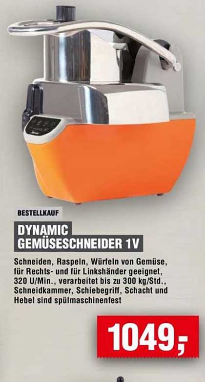 Der reguläre Preis für den DYNAMIC GEMÜSESCHNEIDER 1V liegt bei 1.049,00 €. Aktuell erhalten Sie ihn hier für nur 5,49 €. Dies bedeutet eine erhebliche Ersparnis und macht das Angebot besonders attraktiv für jeden, der in die Gastronomie oder die professionelle Küchenarbeit einsteigen möchte.