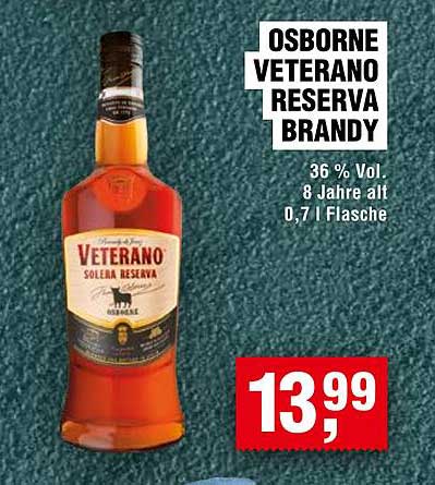 Genießen Sie den exquisiten OSBORNE VETERANO RESERVA BRANDY, der Ihnen in der Zeit vom 16. bis 22. Oktober 2025 zu einem unschlagbaren Preis angeboten wird. Dieser Brandy aus der renommierten Bodega Osborne vereint Tradition und Qualität und ist perfekt für feierliche Anlässe oder entspannte Abende zu Hause.