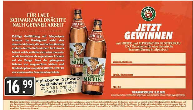 Sehen Sie sich jetzt das Alpirbsbacher Schwarzwald Michel Helles Angebot im HIEBER Prospekt an. Dieses Angebot ist gültig von 05.10.2025 bis 11.10.2025.