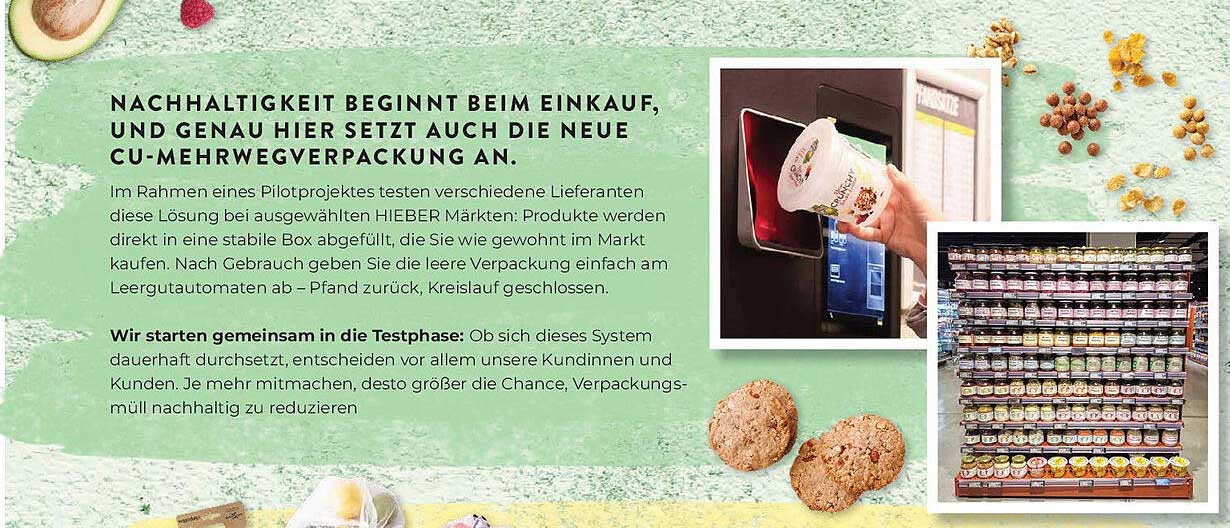Nachhaltigkeit beginnt beim Einkauf, und genau hier setzt auch die neue CU-Mehrwegverpackung an. Diese innovative Lösung bietet Ihnen die Möglichkeit, umweltfreundlicher einzukaufen, ohne auf gewohnte Produkte verzichten zu müssen. Mit dem Pilotprojekt in ausgewählten HIEBER Märkten können Sie Produkte direkt in eine nachhaltige Box abfüllen, die Sie im Markt gewohnt kaufen. Das System stellt sicher, dass nach Gebrauch die leere Verpackung einfach am Leergutautomaten abgegeben werden kann und somit der Kreislauf geschlossen wird.