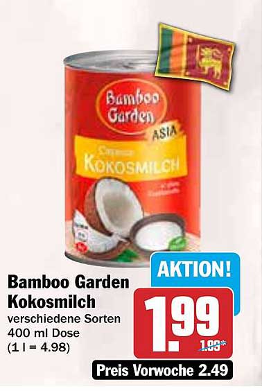 Sehen Sie sich jetzt das Bamboo Garden Kokosmilch 400 ml Dose - jetzt zum Aktionspreis! Angebot im Hit Prospekt an. Dieses Angebot ist gültig von 13.10.2025 bis 18.10.2025.