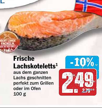 Aktuell können Sie die frischen Lachskoteletts zum attraktiven Preis von nur 2,49 EUR pro 100 g erwerben, was eine Ersparnis von 10% im Vergleich zum regulären Preis von 2,79 EUR bedeutet. Dies macht das Angebot besonders attraktiv für alle, die frischen Fisch zu einem fairen Preis genießen möchten.