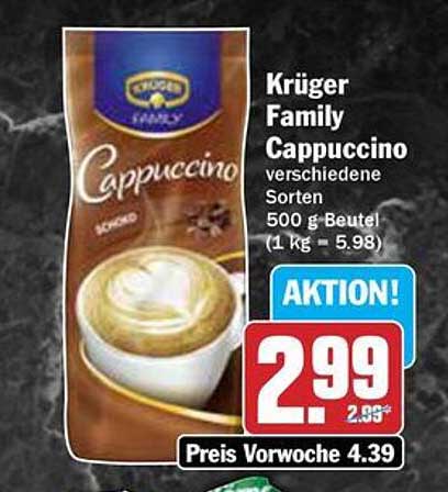 Sehen Sie sich jetzt das Krüger Family Cappuccino verschiedene Sorten 500 g-Beutel Angebot im Hit Prospekt an. Dieses Angebot ist gültig von 23.06.2025 bis 28.06.2025.