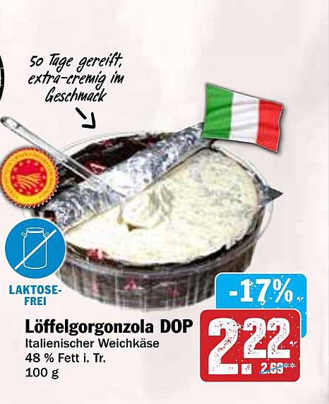 Sehen Sie sich jetzt das Löffelgorgonzola DOP - Italienischer Weichkäse Angebot im Hit Prospekt an. Dieses Angebot ist gültig von 21.04.2025 bis 26.04.2025.