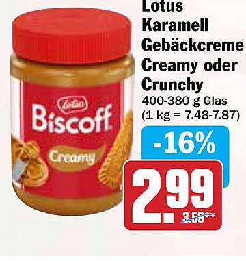 Sehen Sie sich das Lotus Karamell Gebäckcreme Creamy Oder Crunchy Angebot bei Hit an! Dieses fantastische Angebot ist jetzt im neuesten Hit Prospekt verfügbar. Nutzen Sie diese Chance und sparen Sie viel bei Ihrem Einkauf.