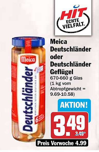 Sehen Sie sich jetzt das Meica Deutschländer oder Deutschländer Geflügel 670-660 g Glas Angebot im Hit Prospekt an. Dieses Angebot ist gültig von 03.11.2025 bis 08.11.2025.