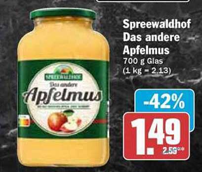 Sehen Sie sich jetzt das Spreewaldhof Das andere Apfelmus 700 g Glas Angebot im Hit Prospekt an. Dieses Angebot ist gültig von 27.10.2025 bis 01.11.2025.