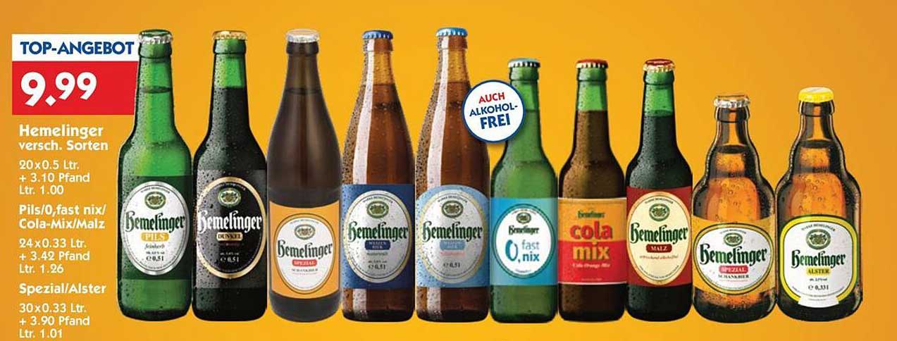 Sehen Sie sich jetzt das Hemelinger verschiedene Sorten für nur 9,99 € Angebot im Hol'ab Getränkemarkt Prospekt an. Dieses Angebot ist gültig von 03.11.2025 bis 08.11.2025.